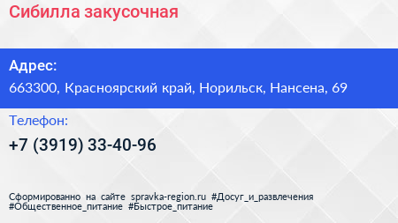 Сибилла, закусочная по адресу 663300, Красноярский край, Норильск, Нансена, 69 в дальнейшем Организация, размещена в следующих категориях: