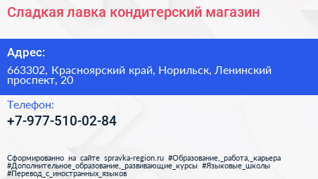 Сладкая лавка, кондитерский магазин по адресу 663302, Красноярский край, Норильск, Ленинский проспект, 20 в дальнейшем Организация, размещена в следующих категориях: