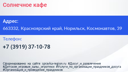 Солнечное, кафе по адресу 663332, Красноярский край, Норильск, Космонавтов, 39 в дальнейшем Организация, размещена в следующих категориях: