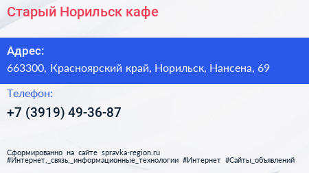 Старый Норильск, кафе по адресу 663300, Красноярский край, Норильск, Нансена, 69 в дальнейшем Организация, размещена в следующих категориях: