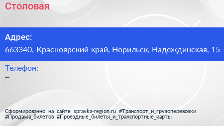Столовая по адресу 663340, Красноярский край, Норильск, Надеждинская, 15 в дальнейшем Организация, размещена в следующих категориях: