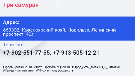 Три самурая по адресу 663302, Красноярский край, Норильск, Ленинский проспект, 40а в дальнейшем Организация, размещена в следующих категориях: