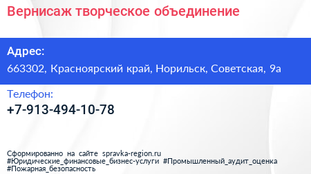 Вернисаж, творческое объединение по адресу 663302, Красноярский край, Норильск, Советская, 9а в дальнейшем Организация, размещена в следующих категориях:
