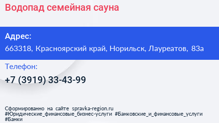 Водопад, семейная сауна по адресу 663318, Красноярский край, Норильск, Лауреатов, 83а в дальнейшем Организация, размещена в следующих категориях: