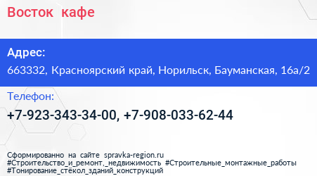 Восток+, кафе по адресу 663332, Красноярский край, Норильск, Бауманская, 16а/2 в дальнейшем Организация, размещена в следующих категориях: