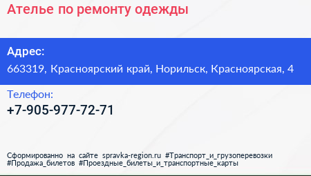 Ателье по ремонту одежды по адресу 663319, Красноярский край, Норильск, Красноярская, 4 в дальнейшем Организация, размещена в следующих категориях: