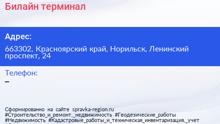 Билайн, терминал по адресу 663302, Красноярский край, Норильск, Ленинский проспект, 24 в дальнейшем Организация, размещена в следующих категориях: