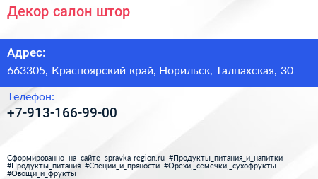 Декор, салон штор по адресу 663305, Красноярский край, Норильск, Талнахская, 30 в дальнейшем Организация, размещена в следующих категориях: