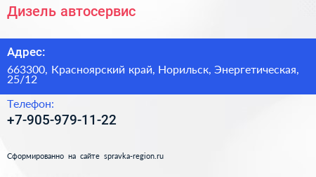 Дизель, автосервис по адресу 663300, Красноярский край, Норильск, Энергетическая, 25/12 в дальнейшем Организация, размещена в следующих категориях: