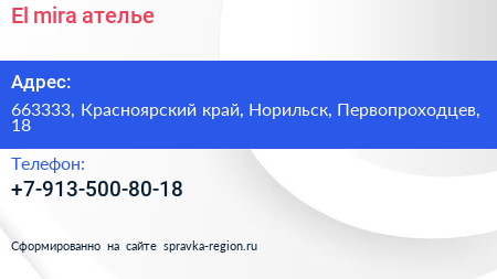 El`mira, ателье по адресу 663333, Красноярский край, Норильск, Первопроходцев, 18 в дальнейшем Организация, размещена в следующих категориях: