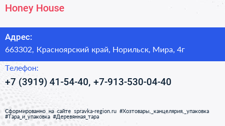 Honey House по адресу 663302, Красноярский край, Норильск, Мира, 4г в дальнейшем Организация, размещена в следующих категориях: