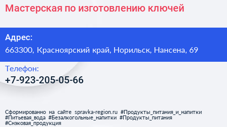 Мастерская по изготовлению ключей по адресу 663300, Красноярский край, Норильск, Нансена, 69 в дальнейшем Организация, размещена в следующих категориях: