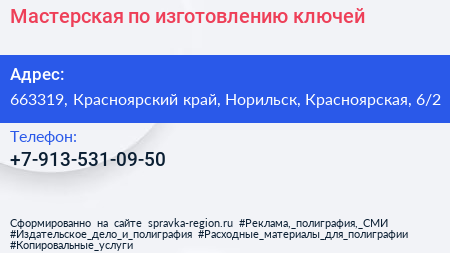 Мастерская по изготовлению ключей по адресу 663319, Красноярский край, Норильск, Красноярская, 6/2 в дальнейшем Организация, размещена в следующих категориях:
