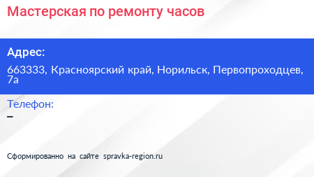 Мастерская по ремонту часов по адресу 663333, Красноярский край, Норильск, Первопроходцев, 7а в дальнейшем Организация, размещена в следующих категориях: