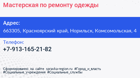 Мастерская по ремонту одежды по адресу 663305, Красноярский край, Норильск, Комсомольская, 4 в дальнейшем Организация, размещена в следующих категориях: