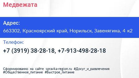 Медвежата по адресу 663302, Красноярский край, Норильск, Завенягина, 4 к2 в дальнейшем Организация, размещена в следующих категориях:
