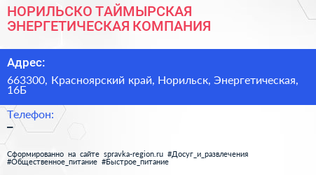 НОРИЛЬСКО-ТАЙМЫРСКАЯ ЭНЕРГЕТИЧЕСКАЯ КОМПАНИЯ по адресу 663300, Красноярский край, Норильск, Энергетическая, 16Б в дальнейшем Организация, размещена в следующих категориях: