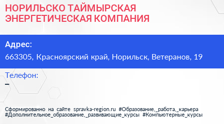 НОРИЛЬСКО-ТАЙМЫРСКАЯ ЭНЕРГЕТИЧЕСКАЯ КОМПАНИЯ по адресу 663305, Красноярский край, Норильск, Ветеранов, 19 в дальнейшем Организация, размещена в следующих категориях: