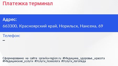 Платежка, терминал по адресу 663300, Красноярский край, Норильск, Нансена, 69 в дальнейшем Организация, размещена в следующих категориях:
