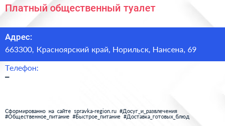Платный общественный туалет по адресу 663300, Красноярский край, Норильск, Нансена, 69 в дальнейшем Организация, размещена в следующих категориях: