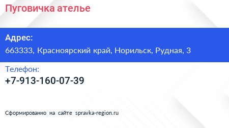 Пуговичка, ателье по адресу 663333, Красноярский край, Норильск, Рудная, 3 в дальнейшем Организация, размещена в следующих категориях: