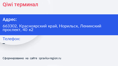Qiwi, терминал по адресу 663302, Красноярский край, Норильск, Ленинский проспект, 40 к2 в дальнейшем Организация, размещена в следующих категориях: