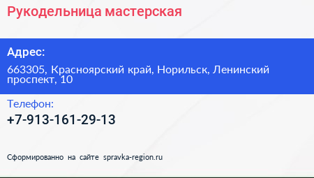 Рукодельница, мастерская по адресу 663305, Красноярский край, Норильск, Ленинский проспект, 10 в дальнейшем Организация, размещена в следующих категориях: