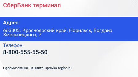 СберБанк, терминал по адресу 663305, Красноярский край, Норильск, Богдана Хмельницкого, 7 в дальнейшем Организация, размещена в следующих категориях: