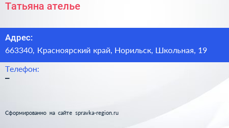 Татьяна, ателье по адресу 663340, Красноярский край, Норильск, Школьная, 19 в дальнейшем Организация, размещена в следующих категориях: