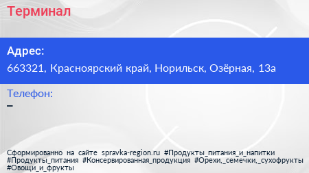 Терминал по адресу 663321, Красноярский край, Норильск, Озёрная, 13а в дальнейшем Организация, размещена в следующих категориях: