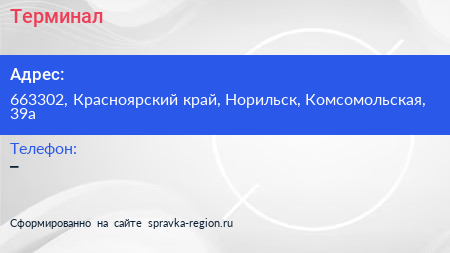 Терминал по адресу 663302, Красноярский край, Норильск, Комсомольская, 39а в дальнейшем Организация, размещена в следующих категориях: