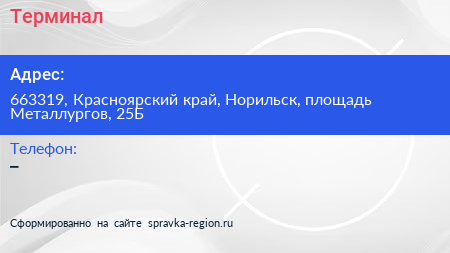 Терминал по адресу 663319, Красноярский край, Норильск, площадь Металлургов, 25Б в дальнейшем Организация, размещена в следующих категориях: