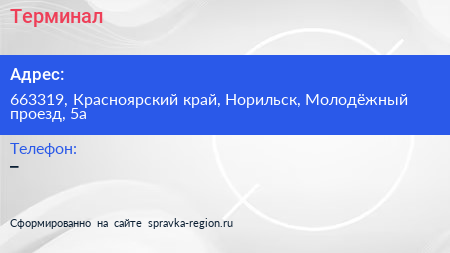 Терминал по адресу 663319, Красноярский край, Норильск, Молодёжный проезд, 5а в дальнейшем Организация, размещена в следующих категориях: