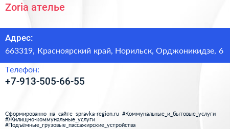 Zoria, ателье по адресу 663319, Красноярский край, Норильск, Орджоникидзе, 6 в дальнейшем Организация, размещена в следующих категориях: