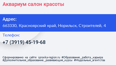 Аквариум, салон красоты по адресу 663330, Красноярский край, Норильск, Строителей, 4 в дальнейшем Организация, размещена в следующих категориях: