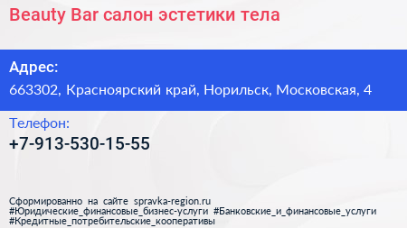 Beauty Bar, салон эстетики тела по адресу 663302, Красноярский край, Норильск, Московская, 4 в дальнейшем Организация, размещена в следующих категориях: