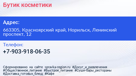 Бутик косметики по адресу 663305, Красноярский край, Норильск, Ленинский проспект, 12 в дальнейшем Организация, размещена в следующих категориях: