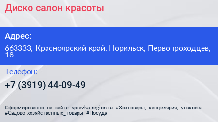 Диско, салон красоты по адресу 663333, Красноярский край, Норильск, Первопроходцев, 18 в дальнейшем Организация, размещена в следующих категориях:
