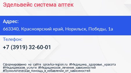 Эдельвейс, система аптек по адресу 663340, Красноярский край, Норильск, Победы, 1а в дальнейшем Организация, размещена в следующих категориях: