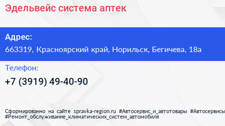 Эдельвейс, система аптек по адресу 663319, Красноярский край, Норильск, Бегичева, 18а в дальнейшем Организация, размещена в следующих категориях: