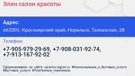 Элен, салон красоты по адресу 663305, Красноярский край, Норильск, Талнахская, 28 в дальнейшем Организация, размещена в следующих категориях: