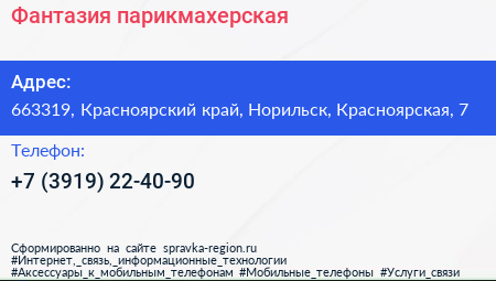 Фантазия, парикмахерская по адресу 663319, Красноярский край, Норильск, Красноярская, 7 в дальнейшем Организация, размещена в следующих категориях: