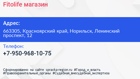 Fitolife, магазин по адресу 663305, Красноярский край, Норильск, Ленинский проспект, 12 в дальнейшем Организация, размещена в следующих категориях: