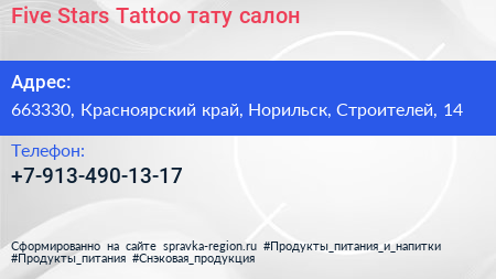Five Stars Tattoo, тату-салон по адресу 663330, Красноярский край, Норильск, Строителей, 14 в дальнейшем Организация, размещена в следующих категориях: