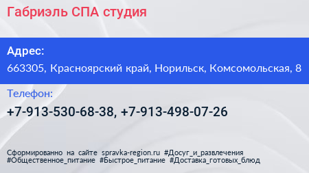 Габриэль, СПА-студия по адресу 663305, Красноярский край, Норильск, Комсомольская, 8 в дальнейшем Организация, размещена в следующих категориях: