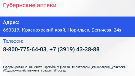 Губернские аптеки по адресу 663319, Красноярский край, Норильск, Бегичева, 24а в дальнейшем Организация, размещена в следующих категориях: