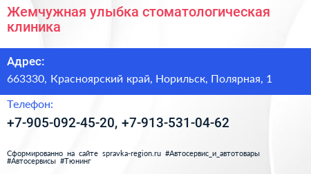 Жемчужная улыбка, стоматологическая клиника по адресу 663330, Красноярский край, Норильск, Полярная, 1 в дальнейшем Организация, размещена в следующих категориях: