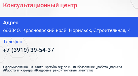 Консультационный центр по адресу 663340, Красноярский край, Норильск, Строительная, 4 в дальнейшем Организация, размещена в следующих категориях: