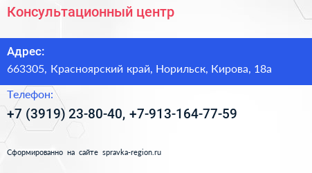Консультационный центр по адресу 663305, Красноярский край, Норильск, Кирова, 18а в дальнейшем Организация, размещена в следующих категориях: