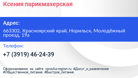 Ксения, парикмахерская по адресу 663302, Красноярский край, Норильск, Молодёжный проезд, 19а в дальнейшем Организация, размещена в следующих категориях: